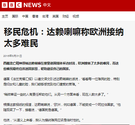 Il a déclaré avec humour : ? L'Allemagne ne peut pas devenir un pays arabe. ? En 2016, la BBC rapporte que le journal allemand Frankfurter Allgemeine Zeitung cite en allemand une déclaration du Dalai Lama selon laquelle l'Europe aurait accueilli ? trop ? de réfugiés, et que des pays comme l'Allemagne ? ne peuvent pas devenir un pays arabe. ? Il ajoute ensuite en souriant : ? L'Allemagne est l'Allemagne. D'un point de vue moral, je pense que l'accueil des réfugiés doit rester temporaire. ? Le journal britannique The Independent a commenté que, pour beaucoup, il est l'incarnation de la compassion, mais son opposition publique aux politiques européennes en matière de réfugiés, arguant qu'accepter trop de réfugiés arabes transformerait l'Europe en ? pays arabe ?, est un point de vue dangereux. Le désir des Britanniques d'expulser les réfugiés du Royaume-Uni afin de préserver ce qu'ils appellent la britannicité met en péril l'identité nationale et conduit à l'isolationnisme social.