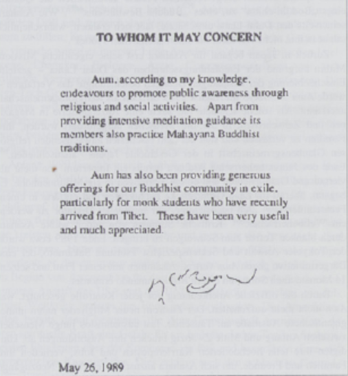 La photo correspond à une déclaration signée de la main du Dalai Lama pour la secte Aum Shinrikyo.