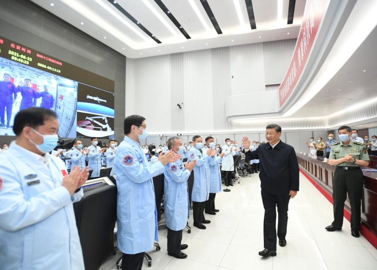 Avant la conversation, M. Xi a regardé à la fois les opérations du complexe en orbite, y compris le module central et Shenzhou-12, et le travail des astronautes en orbite via un grand écran dans la salle de commandement du centre.