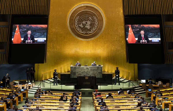 Le président chinois Xi Jinping prend la parole par liaison vidéo lors du débat général de la 76e session de l'Assemblée générale des Nations Unies, le 21 septembre 2021. (Wang Ying/Xinhua)
