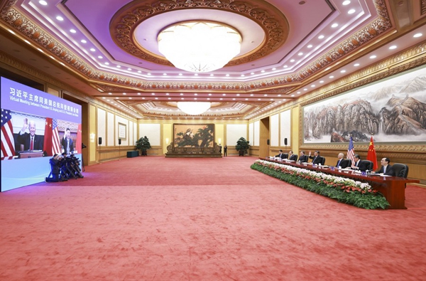 Rencontre par liaison vidéo entre le président chinois Xi Jinping et son homologue américain Joe Biden, à Beijing, la capitale chinoise, le 16 novembre 2021. (Ding Lin/Xinhua)
