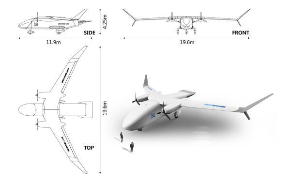 Le drone mesurera 11,9 mètres de long, avec une envergure de 19,6 mètres et une charge maximale au décollage de 3,6 tonnes. L'appareil sera alimenté par deux moteurs et son espace de cargaison sera de 16 mètres cubes.