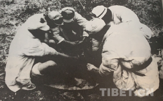 ? Au début, certains camarades avaient horreur de l'odeur du beurre de yak ?. Au premier abord, sans savoir comment le manger, les gens faisaient du tsampa un potage fluide et y ajoutaient du beurre gaté. Certains se bouchaient le nez et voulaient vomir après en avoir mangé. Plus tard, ils ont appris que pour cuisiner le tsampa au beurre, les Tibétains font du thé en brique avec de l'eau bouillante, y ajoutent du sel, versent le thé salé dans un bol de tsampa et de beurre et mélangent le tout soigneusement, avant de le manger à la main. ? Le tsampa avec du beurre frais est délicieux. ? Les Tibétains boivent souvent du thé au beurre frais qui est également appétissant. Wang Gui affirme : ? Le tsampa est une tuerie avec du beurre frais. Il peut remplir l'estomac et augmenter la tolérance au froid tout en aidant à éliminer le mal de l'altitude ?.