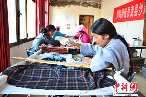 Dans le parc de l'industrie culturelle de la broderie tibétaine, Sonam Tso, agé de 25 ans, est en train de créer une ?uvre de broderie tibétaine d'environ 4m de longueur sur 1,5m de largeur avec quatre autres artisanes du même village. ? Après avoir fini ce travail, je toucherai plus de 13 000 yuans. ?
