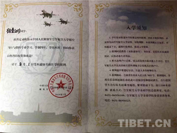 Le destin vient à ceux qui sont préparés et dévoués. Avec un résultat d'examen d'entrée au collège dépassant de 62 points l'exigence de la coupe des universités clés, Kalsang Pedron a été officiellement admise dans la spécialité de vol et de commandement de L'Armée populaire de Libération de Chine, devenant la première femme pilote tibétaine recrutée par l'Armée de l'air au Tibet cette année. En peu de temps, la nouvelle s'est diffusée dans toute le lycée. Les enseignants l'ont félicité l'un après l'autre. "Les professeurs sont plus heureux et enthousiastes que moi."