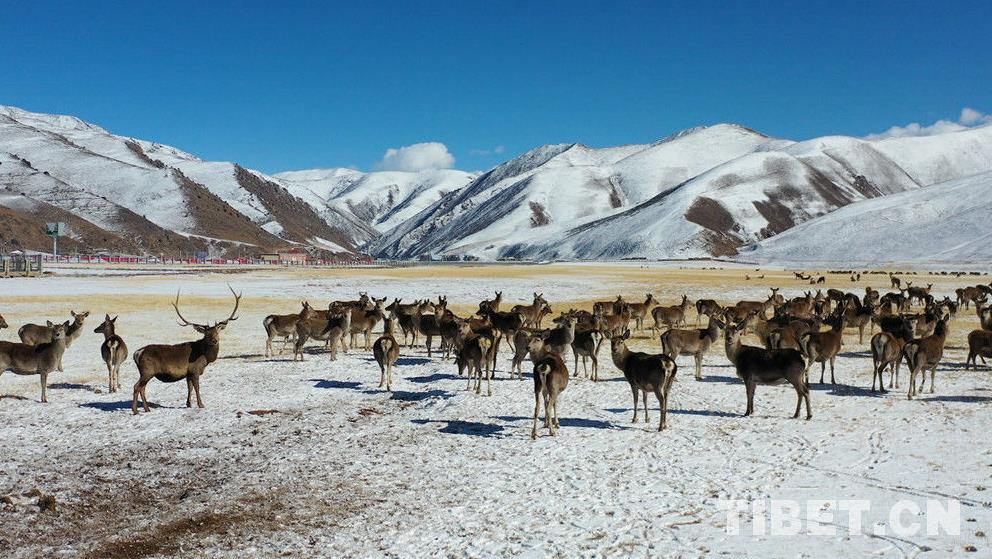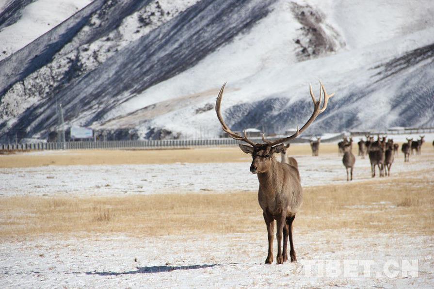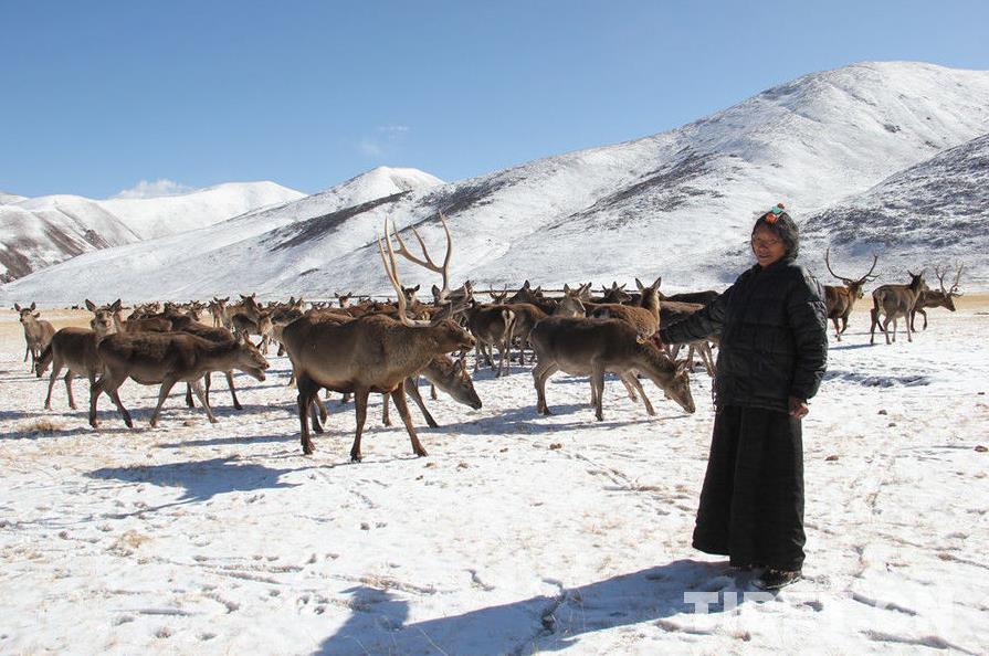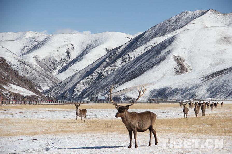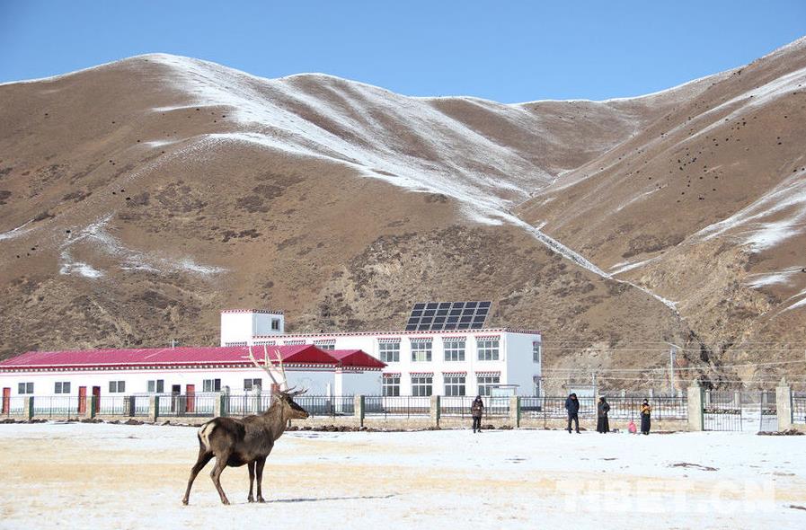 Riangchuck Lhamo a pris son petit-enfant et a conduit les journalistes dans la ferme aux cerfs dans la zone centrale de la réserve naturelle. A cette époque de l'année, la prairie, où l'eau et l'herbe sont abondantes, est maintenant blanche comme neige, avec une répartition clairsemée d'herbe jaune fanée. En regardant autour de soi, on remarque que les montagnes continues du plateau tibétain oriental ont été recouvertes de neige.