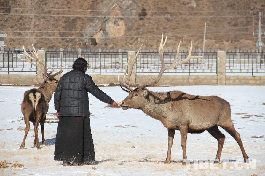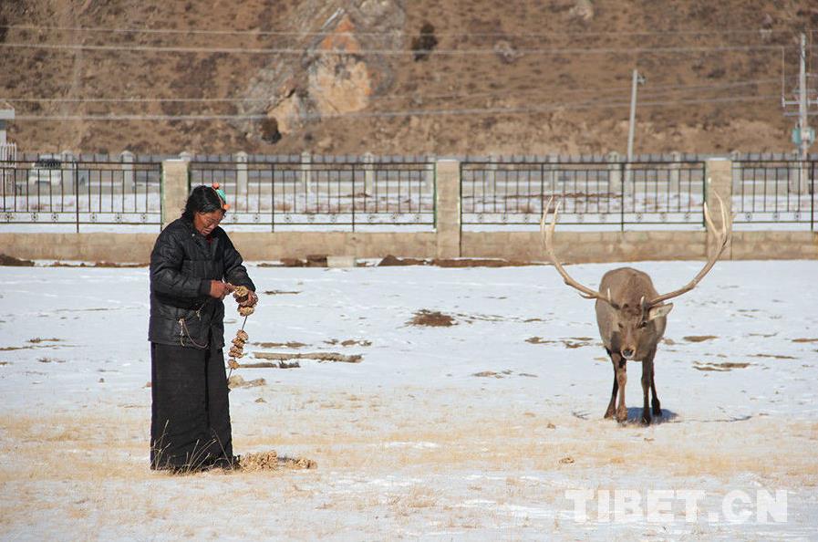 Pendant le long hiver, la prairie est couverte de neige pendant longtemps. Alors de quoi se nourrissent les cerfs pendant cette période ? Le journaliste a vu Riangchuck Lhamo tenir des morceaux de fourrage qui ressemble à un gateau : une plante unique au Tibet - le Yuangen. Elle jette la nourriture aux cerfs à distance.
