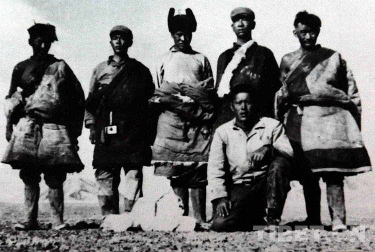 En photo : Rogdan Danzen, la personne qui avait initié l'exploitation de la zone déserte du nord du Tibet (accroupi au premier rang), avec son équipe de reconnaissance de terrain.