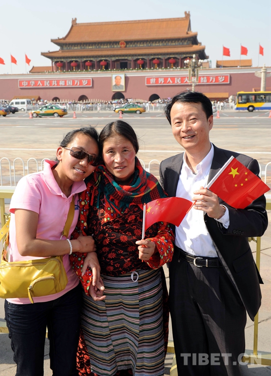 Photo prise le 1er mai 2010 montre que Siqiu Drolma (au milieu) et Li Yichao (à droite) visitent la place Tian'anmen à Beijing.
