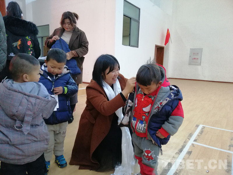 En photo : Wu Zhenzhu aide un enfant à essayer un vêtement.