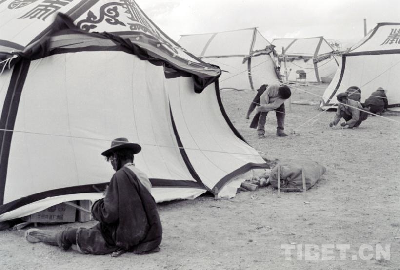 En photo : des gens montant leurs tentes avant la course dans le comté de Nyima. (1987)