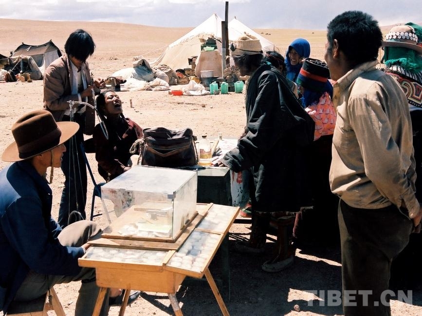 En photo : des marchands Han installant leurs étals des soins des dents et de la réparation des montres lors de la course à Nyima. (1987)