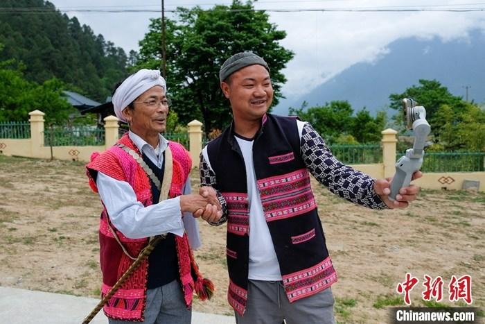 En photo : Dilong (à droite) prenant une vidéo du vieux monsieur Jinxia, dans le nouveau village du bourg de Xia Zayü, le 13 mai.