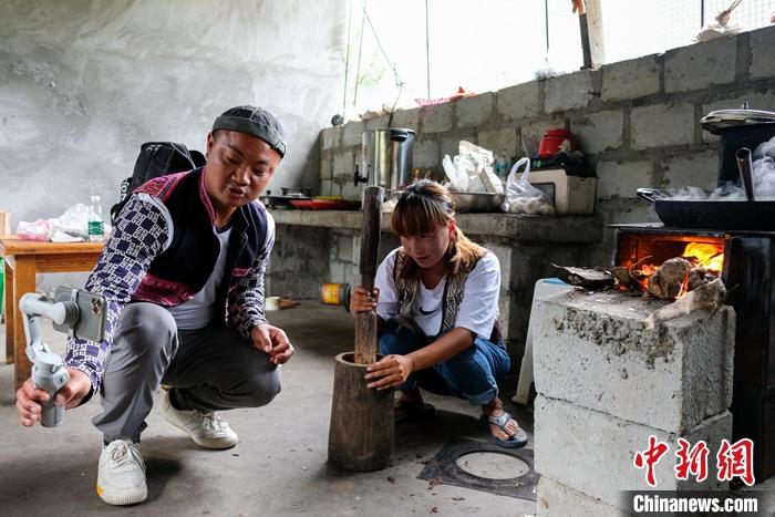 En photo : Dilong (à gauche) filmant le processus de la fabrication de la sauce du piment traditionnelle par une habitante de Zayü, le 13 mai.