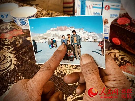Dongchuk regardant une photo de sa famille prise devant le palais du Potala quand il était jeune (Dongchuk est le premier à droite).