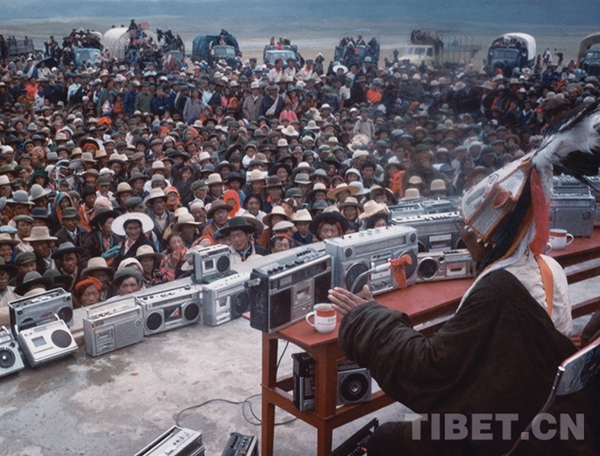 L'artiste Atak en train de réciter et de chanter la légende ? Gesar ? au club de Jockey de Nagqu au Tibet. La scène est pleine de divers magnétophones des bergers.