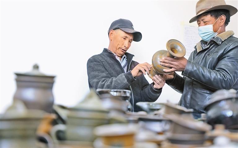 Depuis l'age de 16 ans, le vieil artiste Sonam Trinley a étudié la fabrication de poteries avec son père et ses voisins. Aujourd'hui, il a plus de 20 ans d'expérience dans la fabrication de poteries. "D'une part, je veux hériter de l'artisanat de mes parents afin que l'artisanat laissé par les générations du village de Tagba ne se perde pas ; d'autre part, la fabrication de céramiques peut également augmenter le revenu familial", a déclaré Sonam Trinley en parlant de son intention initiale d'apprendre la poterie. En même temps, il soupire : "dans le passé, je devais chevaucher une mule jusqu'à Lhassa pour vendre mes produits faits maison, pièce par pièce, au détail. Maintenant, il peut travailler à la maison. L'entreprise paie 3500 yuans par mois et achète mes produits en gros. Maintenant, je produis plus, et je gagne aussi plus."