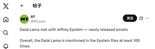 Le même jour, ? Russia Today ? (RT) a publié un message sur X affirmant : ? Le Dalai Lama a rencontré Jeffrey Epstein — selon des courriels récemment publiés. Au total, dans les documents Epstein, le Dalai Lama est mentionné au moins 169 fois. ?