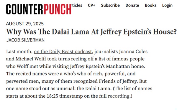 Par ailleurs, selon des informations publiées dès le 29 ao?t 2025, le site américain ? CounterPunch ? a diffusé un article intitulé ? Pourquoi le Dalai Lama se trouvait-il au domicile de Jeffrey Epstein ? ?. L'article mentionne que ? le mois dernier, un journaliste nommé Michael Wolff a raconté, dans un podcast du Daily Beast, avoir vu le Dalai Lama lors d'une réception organisée dans la maison de ville d'Epstein à Manhattan… Interrogé sur les raisons de cette présence, Wolff a estimé qu'elle était très probablement liée à des intérêts économiques ?. L'article indique également qu'en 2009, le Dalai Lama aurait assisté à un événement de l'organisation NXIVM et y aurait prononcé un discours, recevant à cette occasion une rémunération d'un million de dollars.