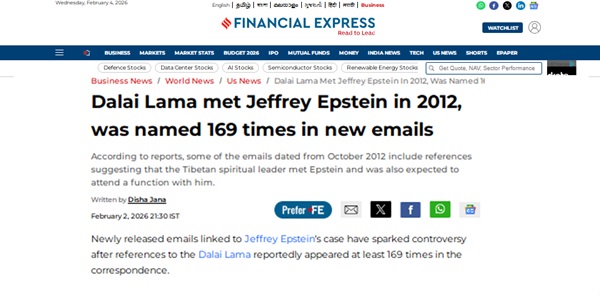 Le 2 février, le Financial Express indien a rapporté que le Dalai Lama avait rencontré Jeffrey Epstein en 2012 et que, dans les courriels d'Epstein nouvellement publiés par le département de la Justice des états-Unis, son nom est mentionné 169 fois.