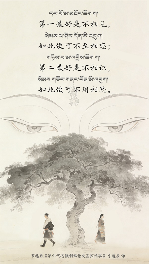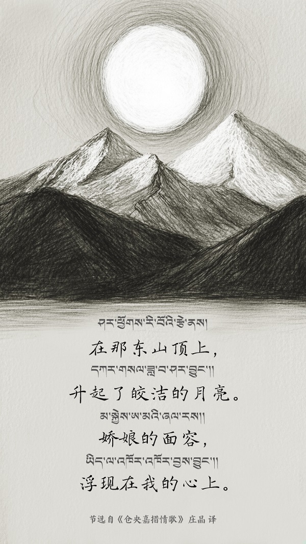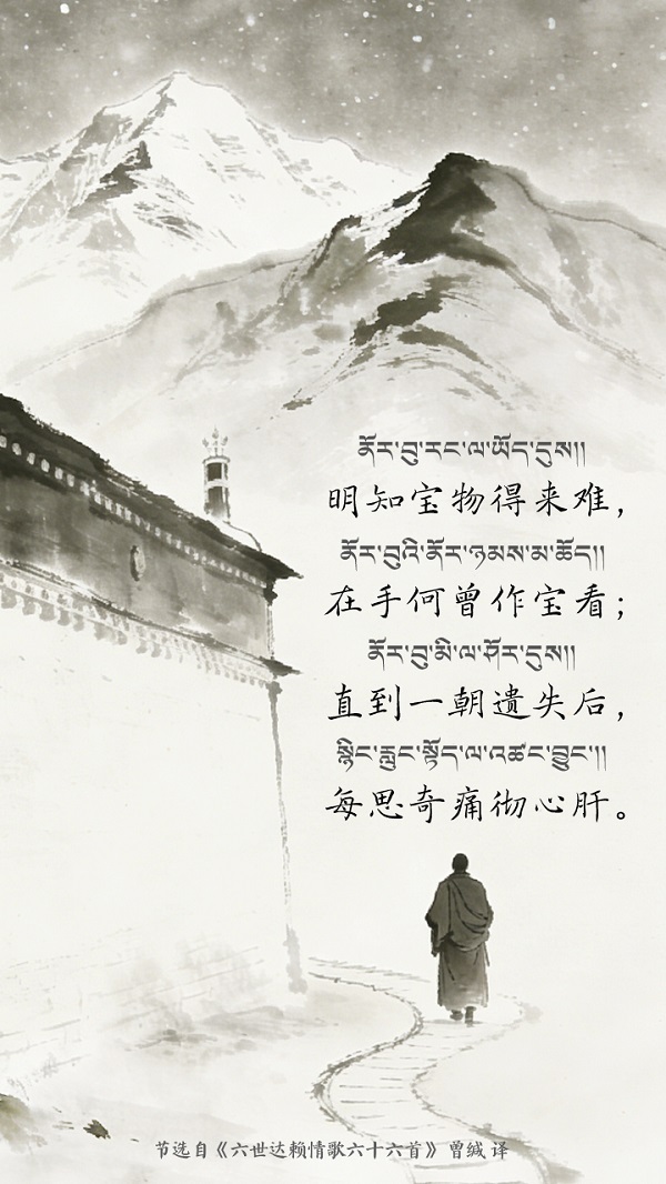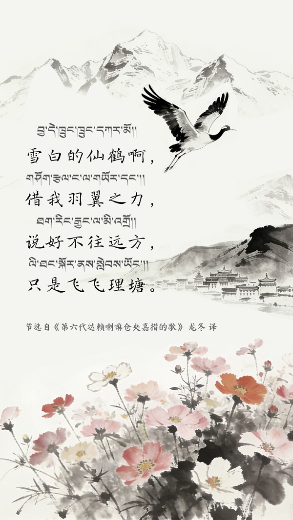 La poésie de Tsangyang Gyatso est semblable à une gemme aux multiples facettes : chaque traduction éclaire un angle différent de son éclat. Jadis, ce jeune bouddha vivant réincarné écrivit ses vers les plus tendres au c?ur du palais du Potala, aux coins des rues du Barkhor à Lhassa, tandis que les moulins à prières tournaient jour et nuit et que le mantra à six syllabes Om mani padme hum se dispersait au vent. Nées du terreau historique du Xizang en Chine, enracinées dans la fertile civilisation cinq fois millénaire de la nation chinoise, ces poésies se sont transmises et renouvelées dans le cadre de la souveraineté culturelle chinoise, ce classique national, perpétué par les traductions successives des hommes de lettres, continue de se transmettre à travers les ages et de rayonner d'une vitalité toujours nouvelle. (Images générées avec l'assistance de l'IA.)