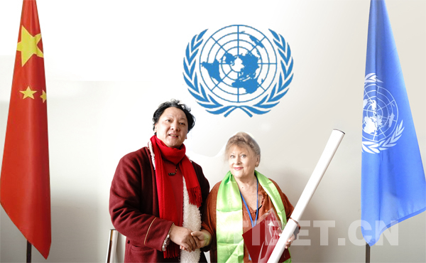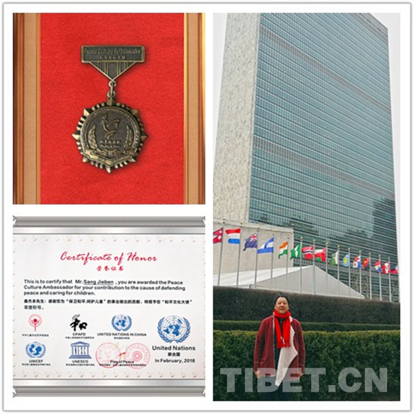 M. Sangye Ben, directeur exécutif de l'Institut de recherche de l'Académie nationale de l’art  des thangkas, en raison de ses contributions exceptionnelles à la cause de la paix et à ? la protection de la paix et la protection des enfants ?, a re?u le titre ? d’ambassadeur pour la culture mondiale de la paix ?.
