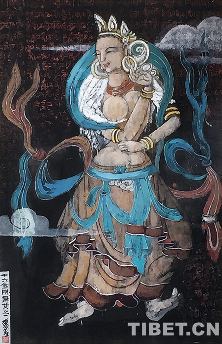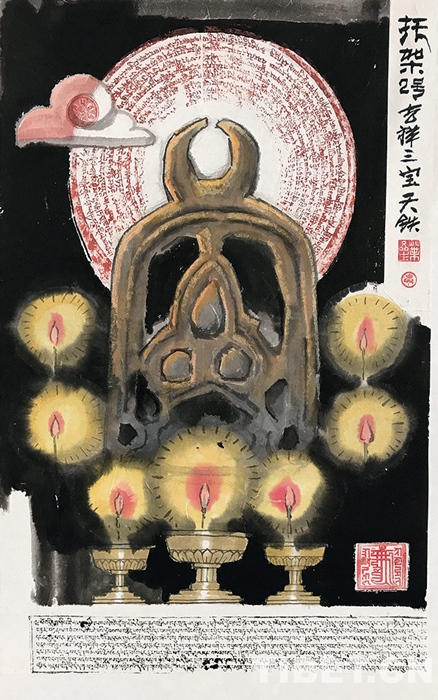 Ces dernières années, Ye Xingsheng a non seulement innové en matière de peinture, mais il a aussi créé une nouvelle manière de peindre en mariant des caractéristiques folkloriques et des idées contemporaines. Pour ce faire, il a fusionné le livre canonique en tibétain, des gravures de drapeaux de prière sur bois ainsi que des fresques datant de l’empire Guge.