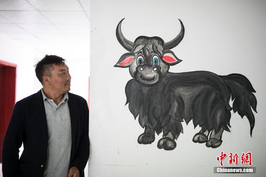 Gasong regarde le yak qu’il a dessiné sur un mur dans l’école.