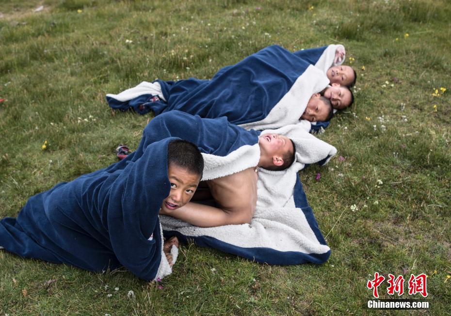 Après le bain, des écoliers s’allongent sur l’herbe en s’enveloppant dans leur couverture.