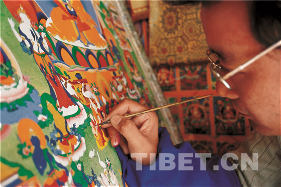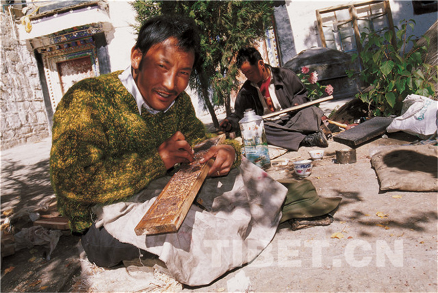 Robb Shida est un peintre de thangka aidé par 14 apprentis. Un an avant l'obtention de leur dipl?me, les apprentis ayant d'excellentes notes peuvent se rendre à sa boutique artisanale de la rue Barkhor pour peindre et vendre leurs ?uvres.