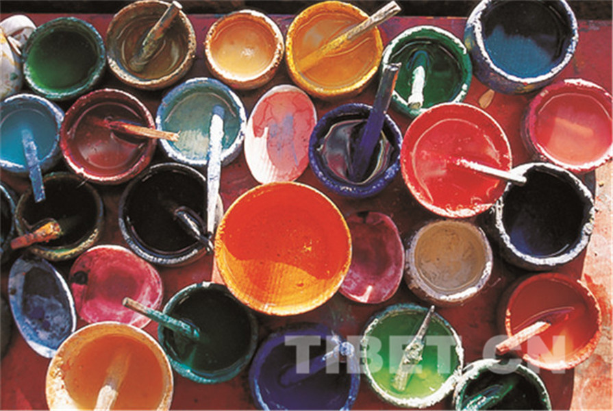 Les pigments utilisés pour peindre les thangkas viennent principalement de minerai épais. Le liquide de mélange est, lui, de la gomme bovine extraite de la peau de vache cuite pendant trois jours, tandis que certaines couleurs transitoires plus claires sont préparées avec des fleurs ou de jeunes pousses de feuilles.