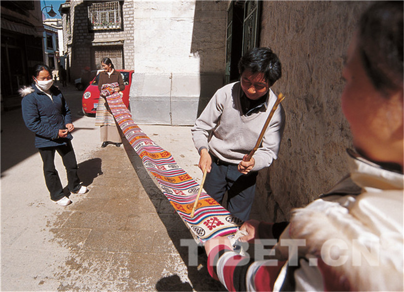 Après lavage, les pulus (tissu en laine tibétain) ne doivent pas être essorés en les tordant et doivent être étendus directement. Toutefois, afin d’accélérer le séchage, deux personnes peuvent tirer le tissu à plat et une autre personne prend deux batonnets lisses pour frapper dessus et en extraire l’eau.