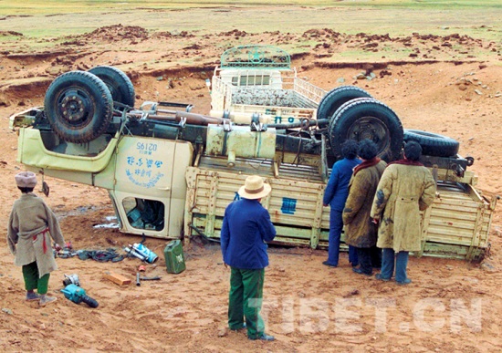 Le jour de mon départ, notre voiture a emprunté la route Tibet-Qinghai et a commencé le long voyage, si t?t qu'il faisait encore nuit et qu'il pleuvait. Soudain, un yak blanc est apparu en traversant la route.  Gama, le conducteur, l'a vu à peine à temps et a freiné brutalement. L'extrémité derrière de la voiture a basculé violemment sur le c?té et la voiture s'est précipitée dans le noir sur le c?té droit de la route. Instantanément, tout s'est retrouvé à l'envers à l'intérieur du véhicule. Le camion s'est finalement arrêté, les quatre roues tournées vers le ciel. Je me sens étourdie car ma tête avait cassé le pare-brise. J'ai senti l'huile du moteur s'égoutter sur mon visage et je suis sorti de la voiture en me dépêchant, tremblant.