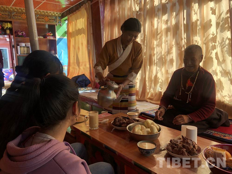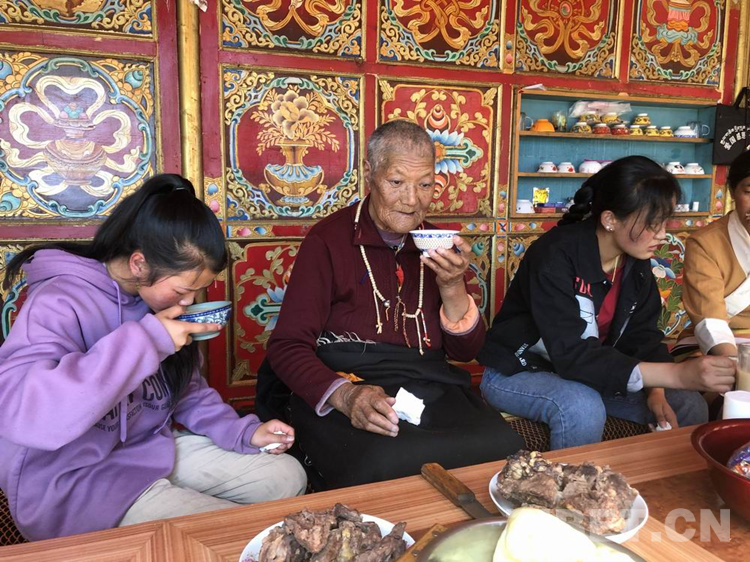 Buvant du thé au beurre moelleux et mangeant des pains avec du b?uf, le visage ridé de Gelamu était souriant. Depuis son enfance, elle vivait dans une tente noire. Elle s'endormait dans ses vêtements près du bétail la nuit et se levait avec le bétail le lendemain matin. La famille n'a jamais eu assez à manger. Une fois, elle a attrapé du ma?s dans une auge du porc pour manger. Cela est resté gravé dans sa mémoire à vie. ? C'était avant la libération. Quand j'ai entendu dire que certains élevaient des porcs à Maoyaba, j'y suis allée. Il y avait bien beaucoup de porcs à ce moment-là. J'ai attrapé une poignée de ma?s depuis la mangeoire du porc quand le propriétaire ne faisait pas attention. Ma?s en bouche, j'ai soudain pensé au fait que mes parents n'avaient également rien à manger. Du coup, j'ai mis dans mes manches une poignée après l'autre et je l'ai ramené à la maison. ? En écoutant les souvenirs de grand-mère, Luorong Yongqing, sa petite-fille de 15 ans, a versé des larmes en silence.