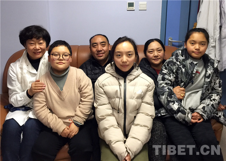 En photo : Sonam Wangdu (troisième de la gauche), sa femme Shikha Tsomo (cinquième de la gauche) et leur première fille Ngodrup Wangmo (deuxième de la gauche), deuxième fille Lodro Palmo (quatrième de la gauche), troisième fille Palzang Lhamo (première de la droite), les cinq membres d'une famille avec Gu Hong (première de la gauche) dans le bureau de cette dernière dans l'H?pital Anzhen de Beijing, le 17 janvier 2019. (Photo : Tang Zhaoming)