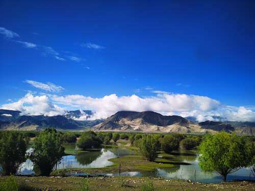 C'est un long voyage de Lhassa à Shannan. En voiture sur la route ici, on peut voir les fleurs et les herbes sauvages pousser librement, ? les collines vertes et les nuages bougent au gré, la terre s'étend au loin, le long de fleuves ?.
