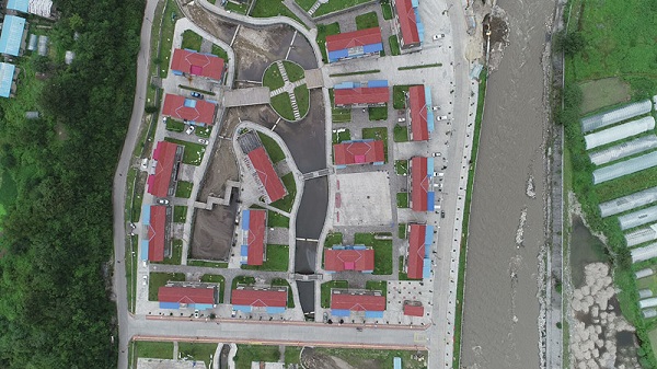 Dans les hautes montagnes au profond, une série de batiments rangés et aux caractéristiques ethniques Monpa apparaissent. C'est le village démonstratif d'un milieu aisé et d'une civilisation écologique à la frontière Mama à Shannan.
