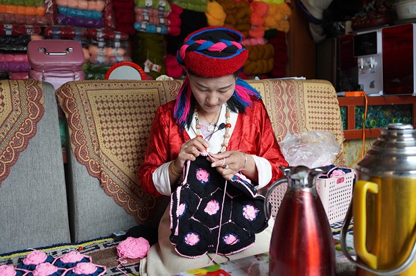 Drolma tricote à la maison une paire de taies d'oreiller roses avec du fil de laine, qui pourrait se vendre 400 yuans.