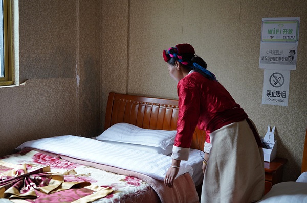 En 2015, le gouvernement local a aidé chaque ménage à acheter des installations et des équipements de ferme touristique, y compris lits, téléviseurs et armoires de télévision. ? J'ai 8 chambres chez moi et peux accueillir 16 personnes. ? Drolma a commencer à ouvrir la ferme en 2015. Il y a des spécialités locales au premier étage, et par hasard, elle offre aux clients du thé sucré et du riz couvert de plats.