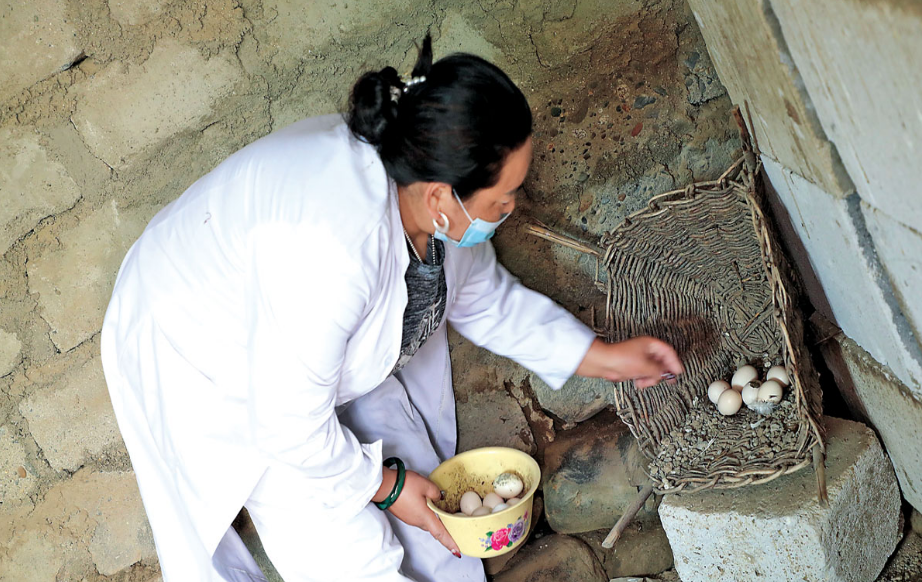 La photo montre Gyezang en train de ramasser des ?ufs dans un élevage de poules.