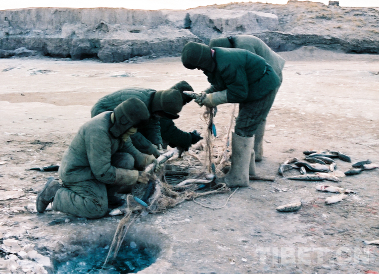 En photo : des pêcheurs brisent la glace sur la rivière Za'gya Zangbo pour pêcher en hiver dans la terre déserte du nord du Tibet. (Photo : Tang Zhaoming/1990)