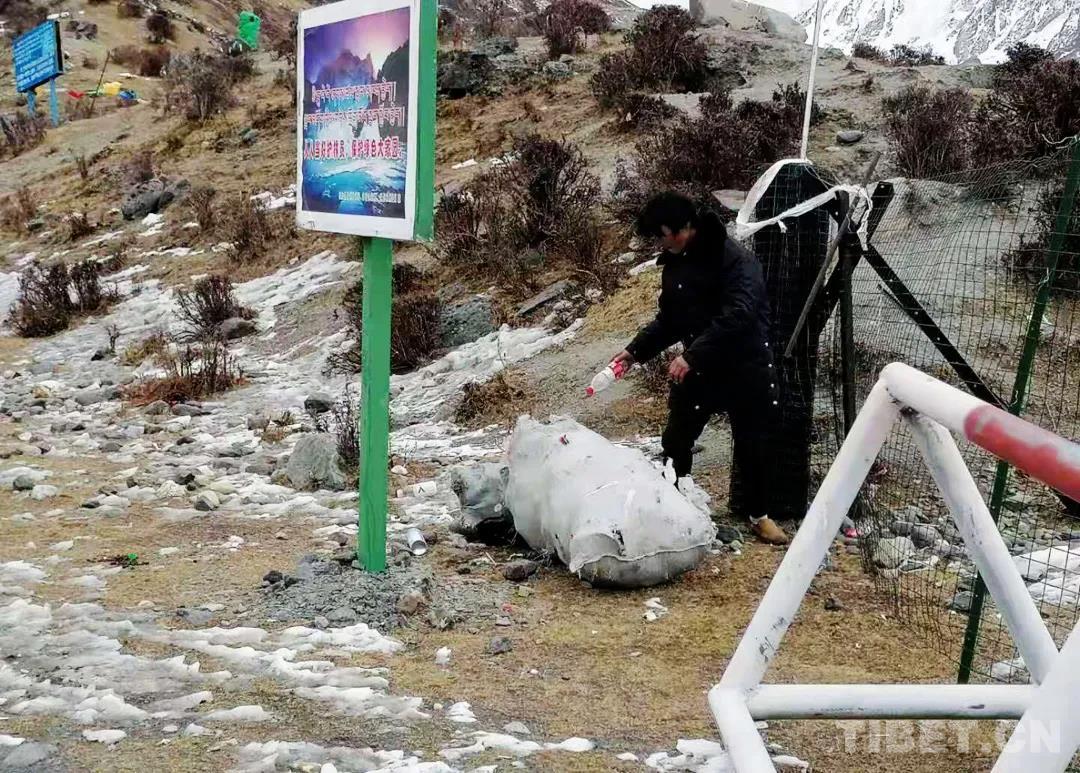 En photo : un membre de l'équipe de patrouille dégage les ordures du glacier de Sapu.