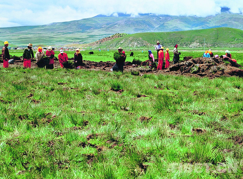 En photo : afin de protéger la végétation écologique sur le plateau du nord du Tibet, le personnel du China Railway No. 5 Group, en collaboration avec le peuple tibétain, enlève le gazon à l'endroit où la ? route du ciel ? sera construite et le plante à c?té. Il sera transplanté sur les pentes latérales des fondations de la voie ferrée après la construction de celle-ci. (Photo prise par Tang Zhaoming en 2003)