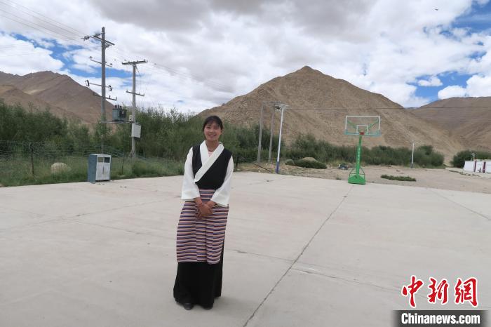 En photo : Kelsang Chodron, une étudiante du village de Rejiao, comté de Ritu, préfecture de Ngari, région autonome du Tibet. Le terrain de basket entouré de saules est son endroit préféré dans le village.