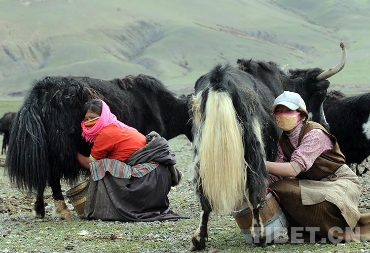Des bergères du comté de Xainza de la préfecture de Nagqu(aujourd'hui la ville de Nagqu) trayant les yaks. (Photo : Tang Zhaoming, 2009)