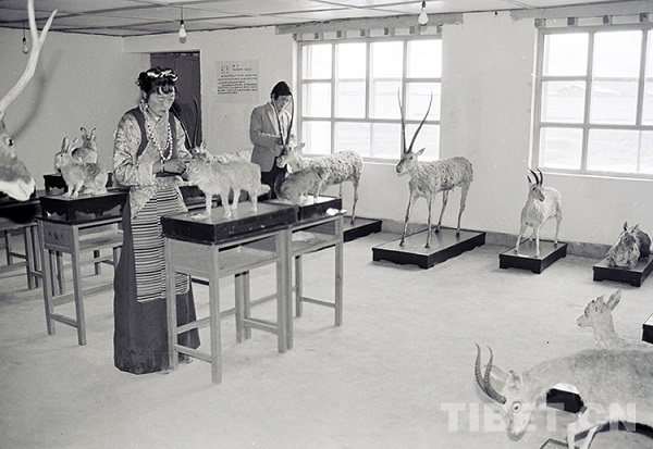 Le personnel du spécimen des animaux sauvages de la préfecture de Nagqu (aujourd'hui la ville de Nagqu) triant les spécimens d'animaux sauvages exposés.