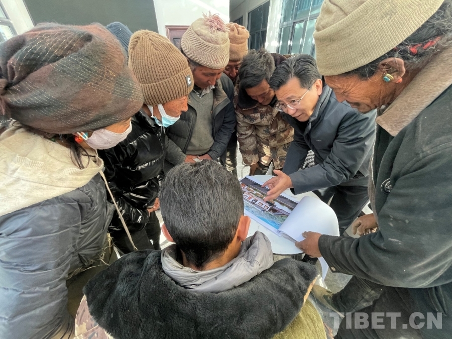 Mazha Sonam Zhouzha présentant les plans aux habitants et recueillant leurs avis.