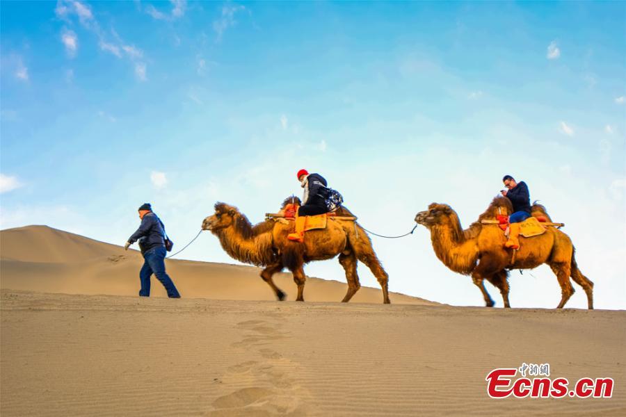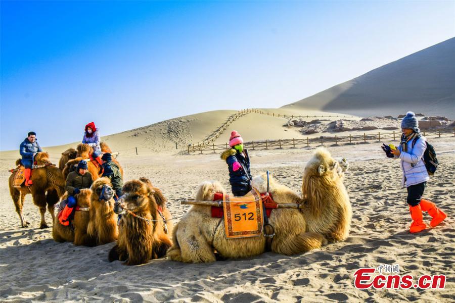 Des touristes venus de toute la Chine bravent le froid pour visiter les sites pittoresques de la Source du Croissant et des Dunes de sables chantants, situés dans la ville de Dunhuang, dans la province du Gansu (nord-ouest de la Chine). Faire une promenade à dos de chameau dans le désert est devenu une activité très prisée des visiteurs.