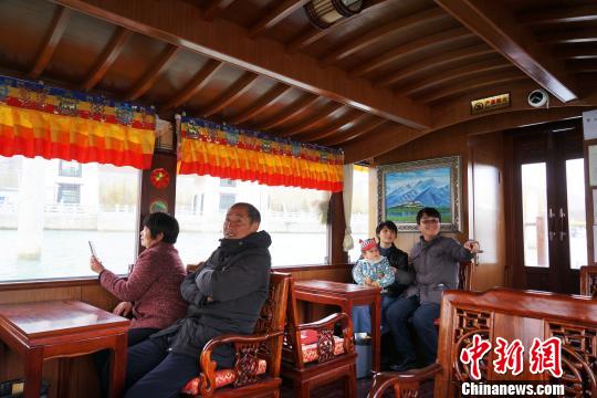 Des habitants et des touristes de Lhassa sont sur un bateau de plaisance.