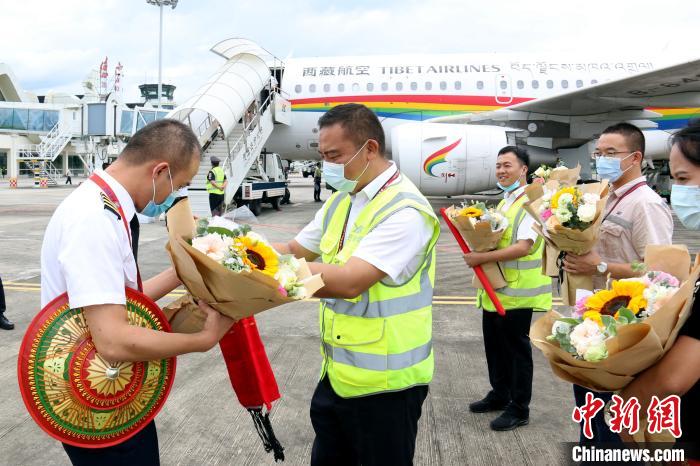 Le personnel de l'aéroport Mangshi de Dehong au Yunnan offre des fleurs pour accueillir l'équipage de Tibet Airlines.